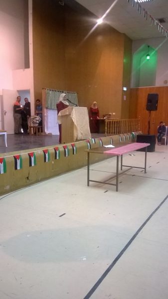 The ceremony began with the Palestinian national anthem, and the ceremony was given by Fathia Abu Hilal and Maysoun Afana.