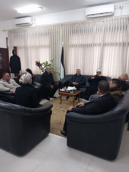 His Eminence, Minister of Awqaf and Religious Affairs, Sheikh Hatem Al-Bakri, and a high-ranking delegation from the ministry, in a meeting with the General Director of the Industrial Islamic Orphanage , Mr. Hassan Tahboub, on the sidelines of the ceremony honoring the pilgrims of Jerusalem for the year 2022 AD, which was held in the institution’s theater in Al-Eizariya.
