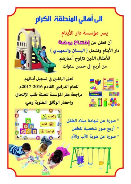 Industrial Islamic Orphanage Institution is pleased to announce the initiation of registration of children aged from four to five years in kindergarten orphanage.