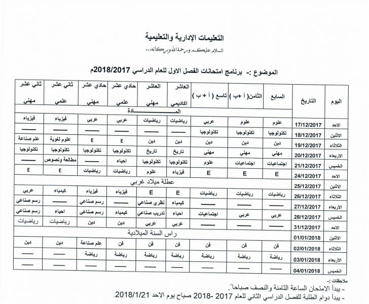 Table of exams for the end of the first semester of the academic year 2011/2018 for the secondary stage in Al-Azariya.